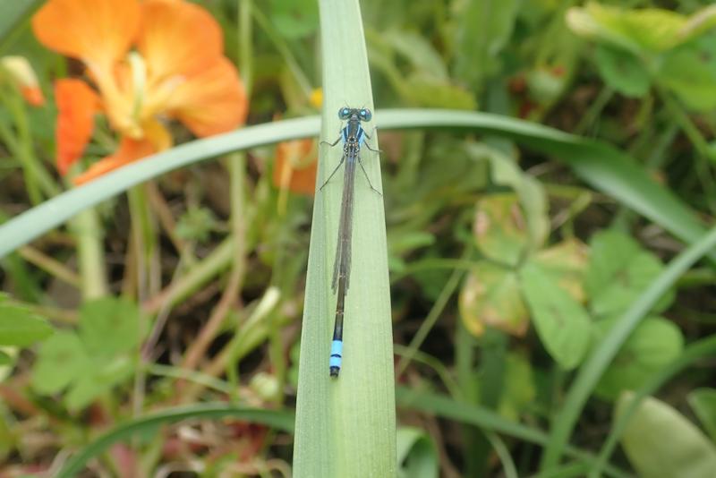A Common Bluetail Damselfly (Ischnura heterosticta) amongst garden nasturtiums.